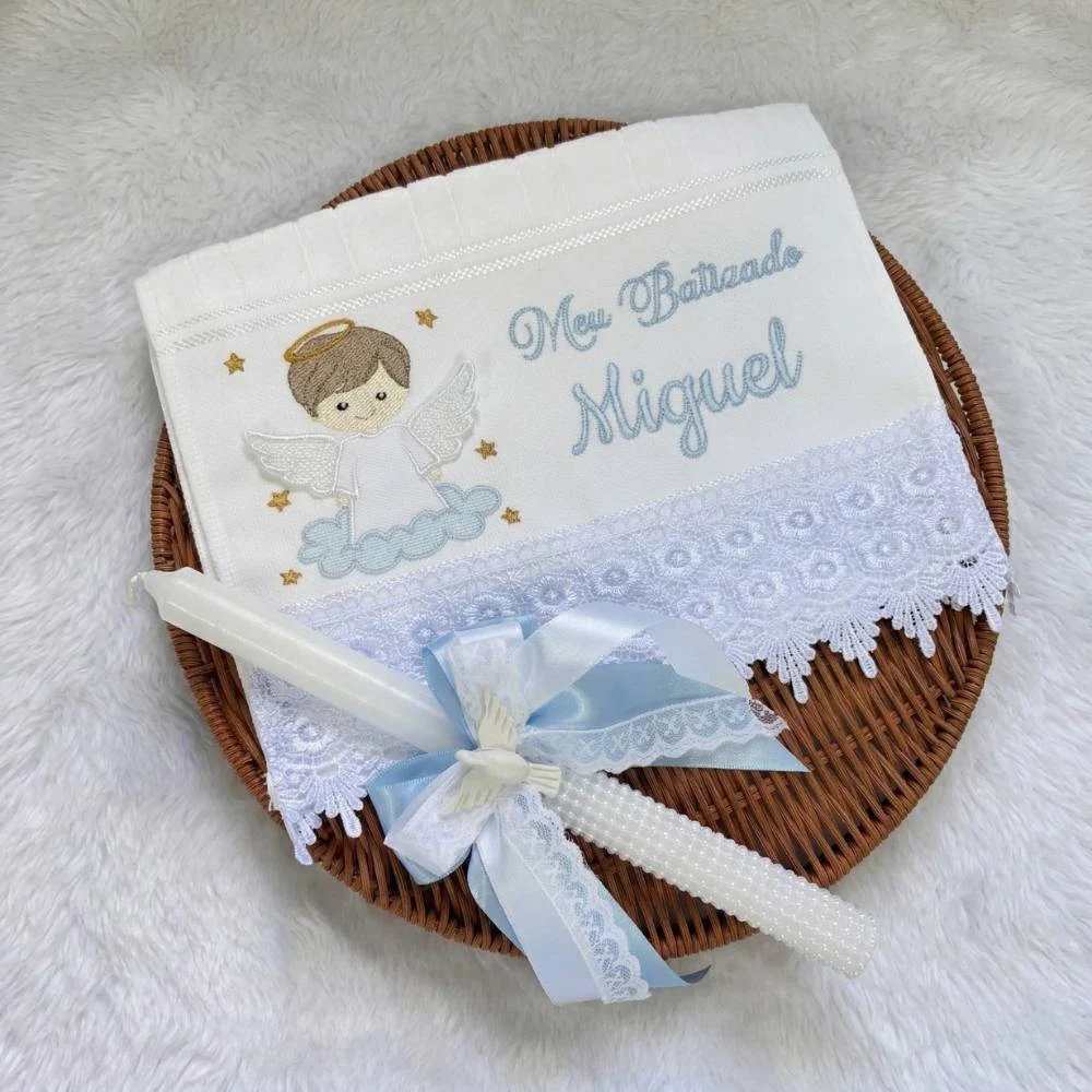 Um kit especial e delicado para tornar o momento do batizado ainda mais inesquecível. Composto por toalha em cambraia de alta qualidade e vela grossa, ideal para a cerimônia. Acompanha embalagem em caixinha, perfeito também para presentear com muito carinho. Medida da toalha: 60 x 40 cm |
