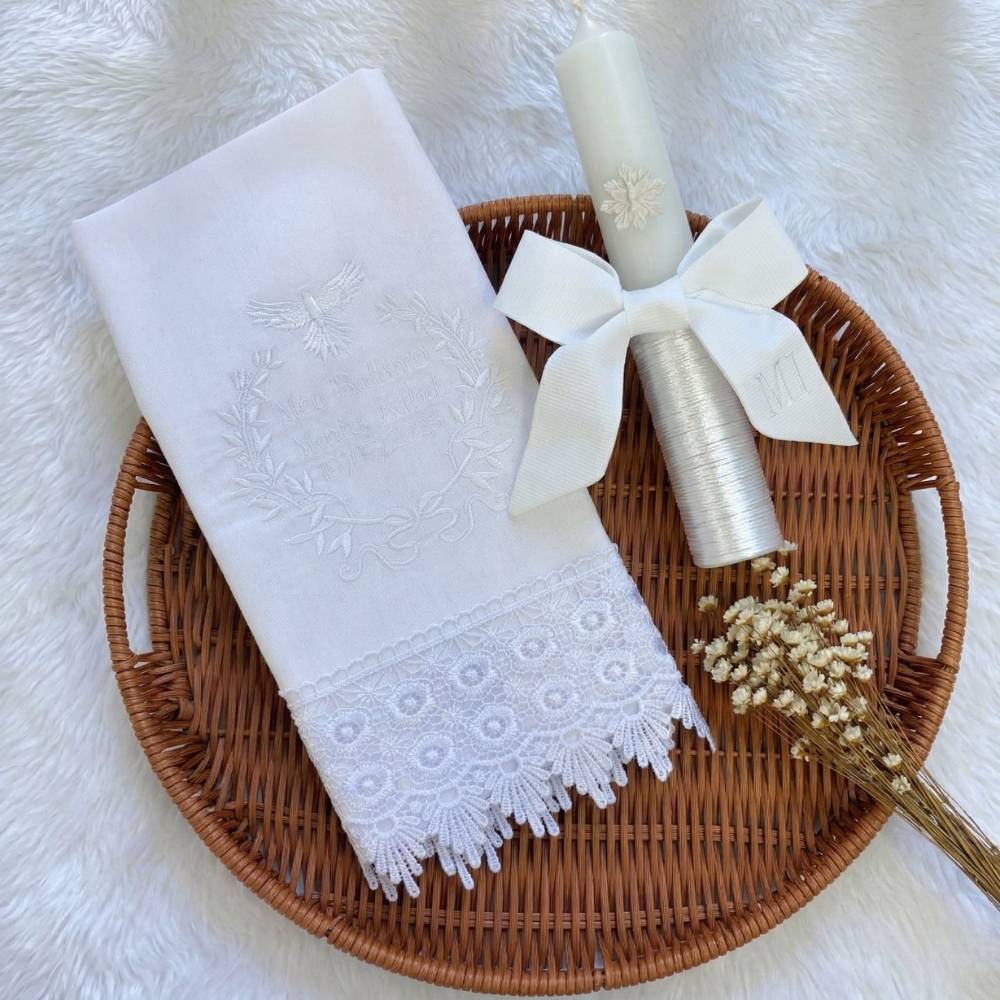 Um kit delicado e especial para celebrar o momento do batizado com carinho e significado. Contém toalhinha e vela, itens essenciais para a cerimônia. Acompanha embalagem em caixinha, ideal para presentear ou guardar como lembrança desse dia único. Medida da toalha: 30 x 45 cm |