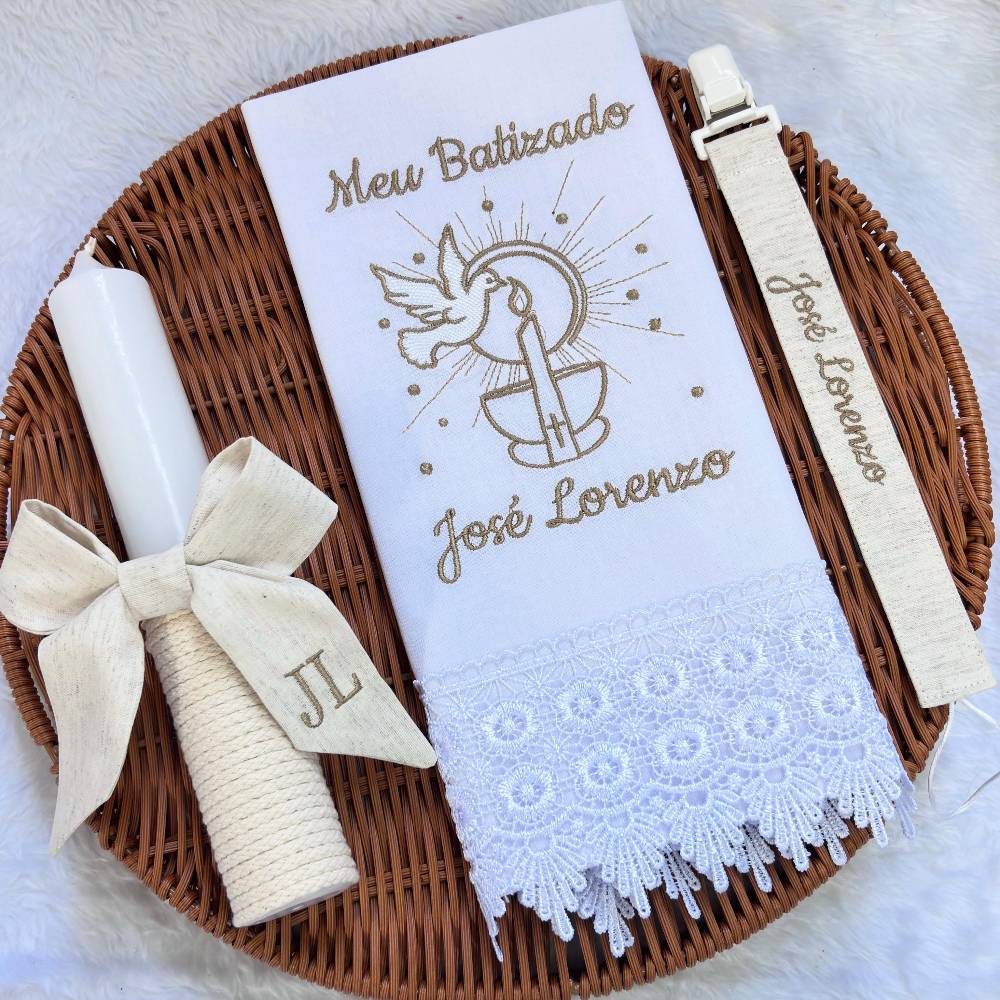 Kit Batizado Essência Divina - Linha Premium Personalizada Com acabamento em linho natural, renda delicada e bordado este kit une o charme artesanal ao luxo sutil, perfeito para quem valoriza peças exclusivas e cheias de significado. O que acompanha: Toalha em tecido nobre personalizada com nome Vela decorada com laço em linho Prendedor de chupeta personalizado em linho Ao adicionar o produto no carrinho, escreva o nome do bebê e a data do batizado( caso deseje bordar) no campo "adicionar observação". |
