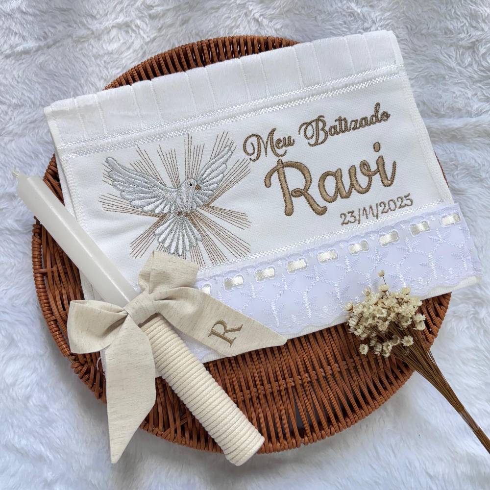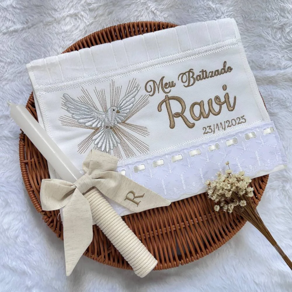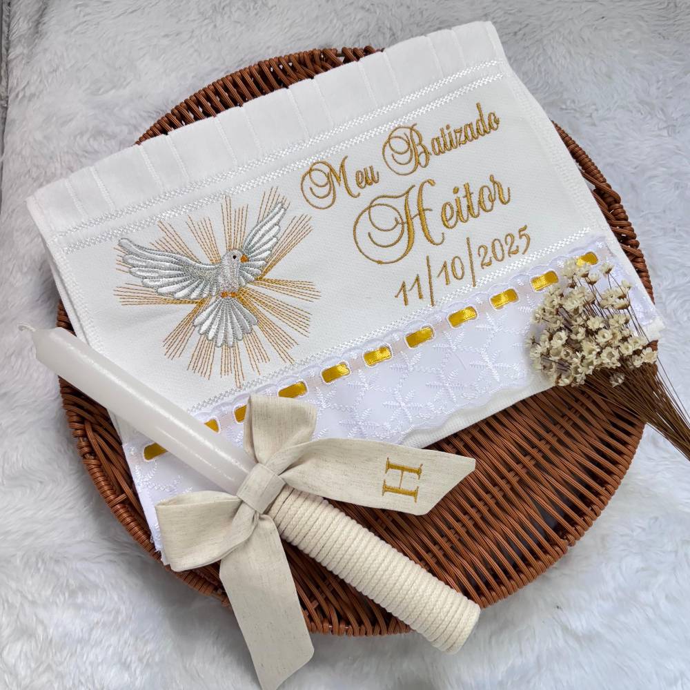 O kit contém toalhinha e vela, itens essenciais para a cerimônia. Acompanha embalagem em caixinha, ideal para presentear ou guardar como lembrança desse dia único. Ao adicionar o produto no carrinho, escreva o nome do bebê e a data do batizado no campo " adicionar observação". Medida da toalha: 30 x 45 cm |