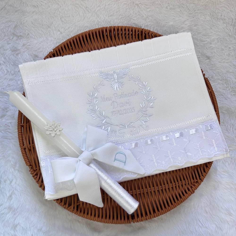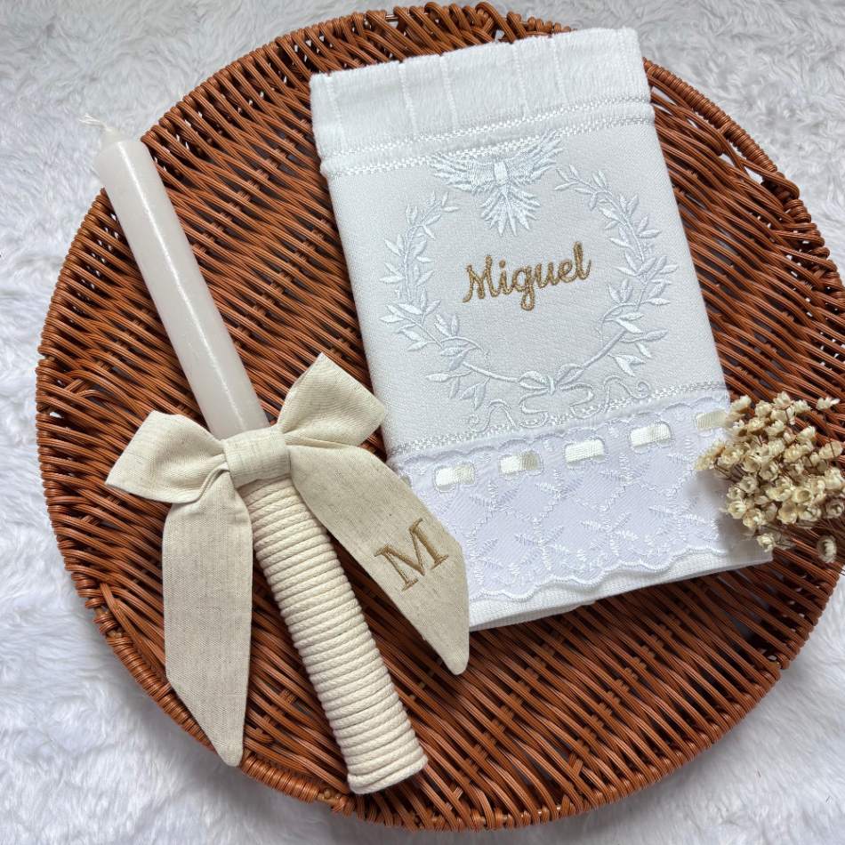 O kit contém toalhinha e vela, itens essenciais para a cerimônia. Acompanha embalagem em caixinha, ideal para presentear ou guardar como lembrança desse dia único. Ao adicionar o produto no carrinho, escreva o nome do bebê e a data do batizado no campo " adicionar observação". Medida da toalha: 30 x 45 cm |